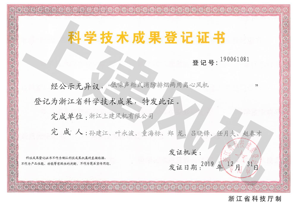 低噪聲柜式消防排煙兩用離心風(fēng)機(jī)箱成果鑒定證書