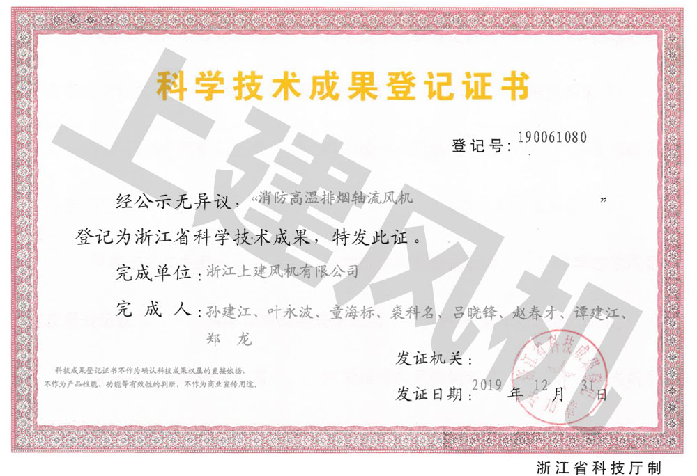 消防高溫排煙軸流風(fēng)機(jī)成果鑒定證書