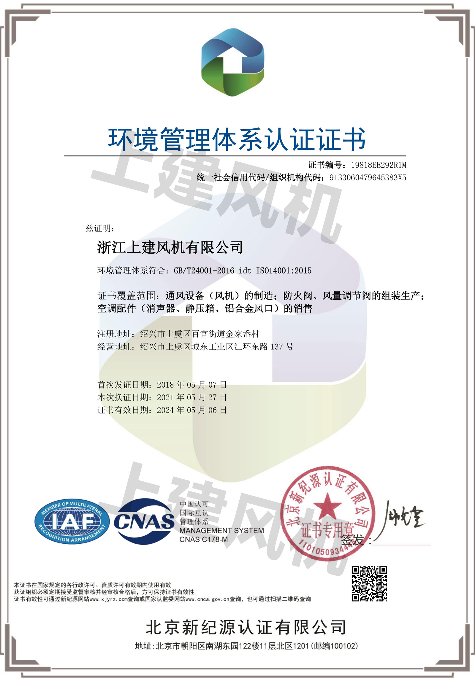 環(huán)境管理體系認(rèn)證證書