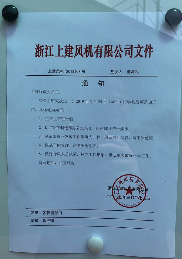 近期浙江上建風(fēng)機(jī)有限公司組織了一次全體管理人員下基層車間的體驗(yàn)式活動(dòng)。有的管理人員幫扶車間進(jìn)行6S的整理、整頓;有的直接上產(chǎn)線進(jìn)行產(chǎn)品的制造作業(yè);有的與車間主任一道探討與解決產(chǎn)品工藝性難題,提高產(chǎn)品力。頓時(shí)成為車間一道靚麗的風(fēng)景。