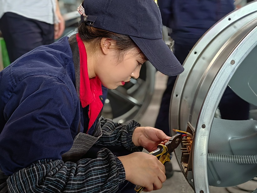 風機接線環(huán)節(jié)選手們個個斗志昂揚,動作麻利,從選尺寸,安裝,擰螺絲,調(diào)平整等各道工序得心應(yīng)手,心靈手巧應(yīng)用的淋漓盡致,讓在場觀摩的公司領(lǐng)導嘖嘖稱贊。