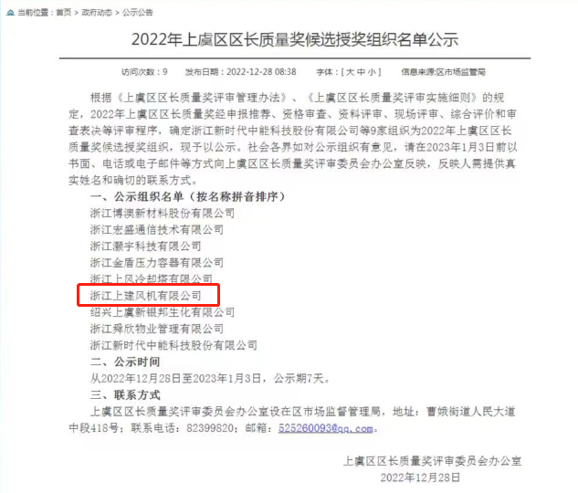 2022年12月,2022年上虞區(qū)區(qū)長質(zhì)量獎候選授獎企業(yè)名單公示結(jié)果顯示,上建風機榮登榜單,獲得2022年上虞區(qū)區(qū)長質(zhì)量獎候選授獎。