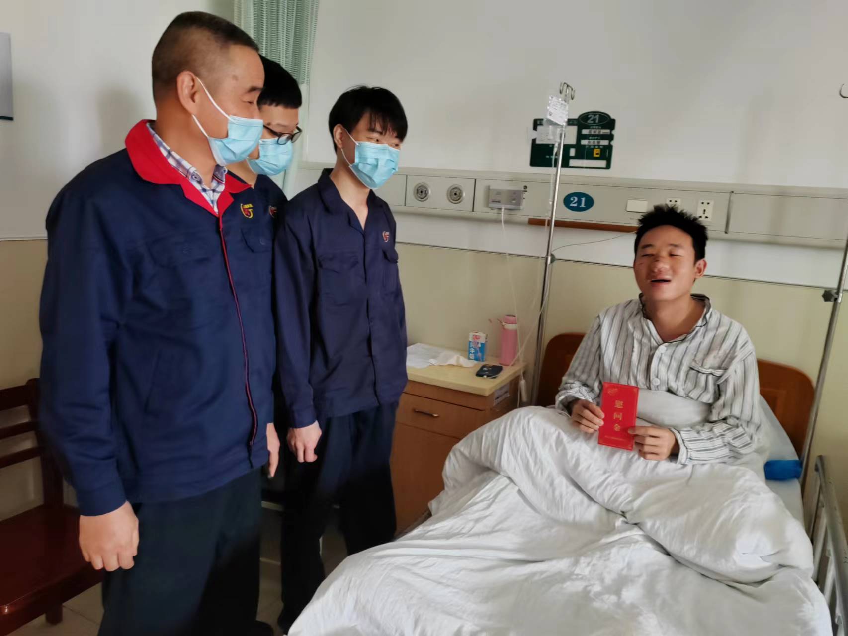 趙總監(jiān)親切與王紹基同志交談,詢問其恢復和治療情況,了解生活上是否困難,鼓勵他積極配合醫(yī)生治療,保持樂觀心態(tài),并為其送去了單位的慰問金,要求車間相關人員要安排好王紹基同志住院期間的保障工作,確保其安心養(yǎng)病,早日康復。親切的話語讓王紹基深刻感受到單位的關愛,王紹基對單位的牽掛和慰問表示由衷的感謝。
