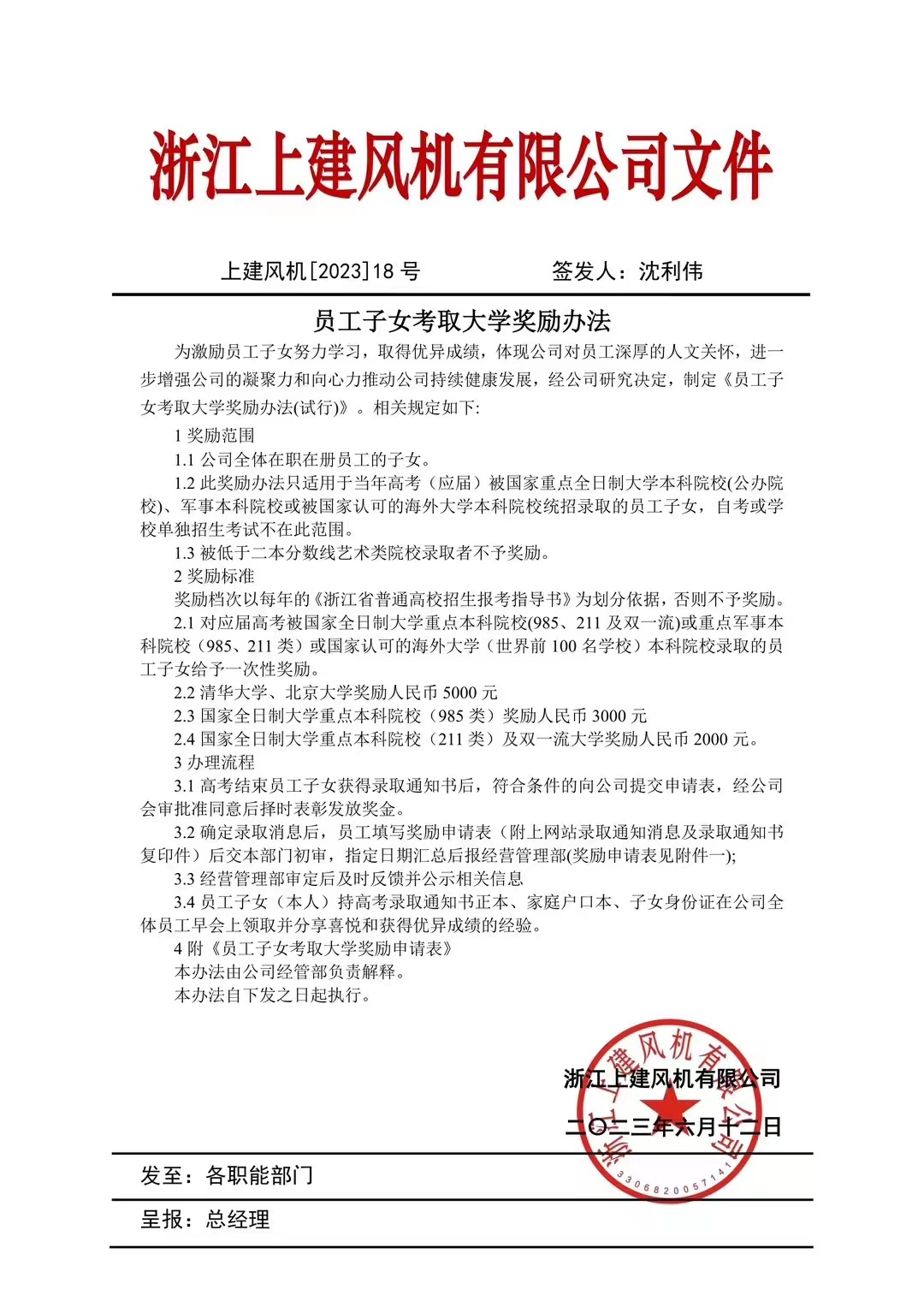 天地人和、潤澤萬物、以人為本為鼓勵上建職工子女勤奮學習、努力成才,在職工中形成關(guān)注子女成長教育的良好風尚。同時增強職工的向心力與歸屬感,彰顯上建天地人和、潤澤萬物、以人為本的經(jīng)營理念。今年起公司將對公司在職員工子女金榜題名、考取功名時給予一定的物資獎勵。祝愿所有上建職工子女勤勉刻苦、求知若渴、回報家庭與社會,祝愿你們在求學道路上自立自強,不負韶華、未來可期!