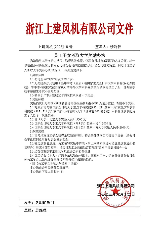 為將公司董事長(zhǎng)童海標(biāo)先生倡導(dǎo)的“關(guān)注員工”的指示精神落實(shí)到實(shí)處。宣傳公司企業(yè)文化,增強(qiáng)員工凝聚力,體現(xiàn)公司對(duì)員工及其親屬的關(guān)愛。讓員工真正感受到公司的溫暖,公司工會(huì)對(duì)員工子女考取重點(diǎn)大學(xué)實(shí)行了獎(jiǎng)勵(lì)制度,得到童海標(biāo)先生的高度關(guān)注并做重要批示。